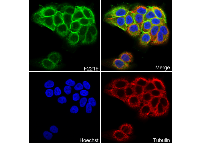 • Immunofluorescent analysis of HACAT cells using F2219 (green, 1:100), Hoechst (blue) and tubulin (Red).