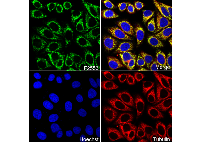 • Immunofluorescent analysis of HepG2 cells using F2553 (green, 1:1000), Hoechst (blue) and tubulin (Red).