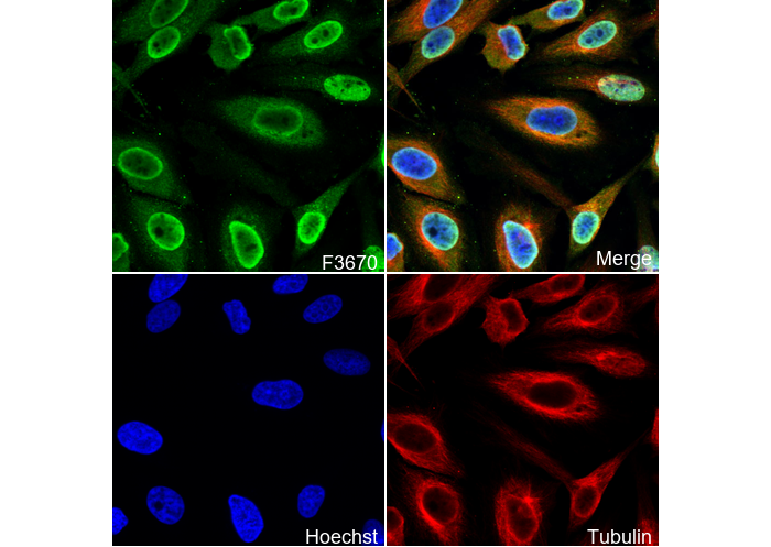 • Immunofluorescent analysis of Hela cells using F3670 (green, 1:500), Hoechst (blue) and tubulin (Red).