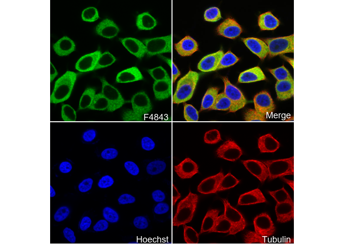 • Immunofluorescent analysis of MCF-7 cells using F4843 (green, 1:1000), Hoechst (blue) and tubulin (Red).