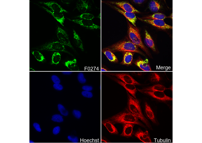 • Immunofluorescent analysis of Hela cells using F0274 (green, 1:200), Hoechst (blue) and tubulin (Red).