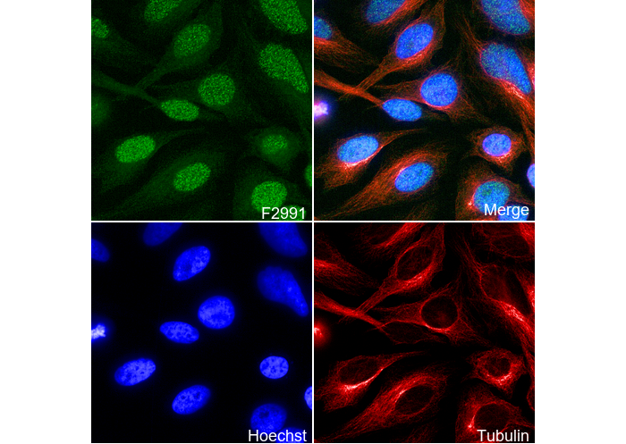 • Immunofluorescent analysis of Hela cells using F2991 (green, 1:100), Hoechst (blue) and tubulin (Red).