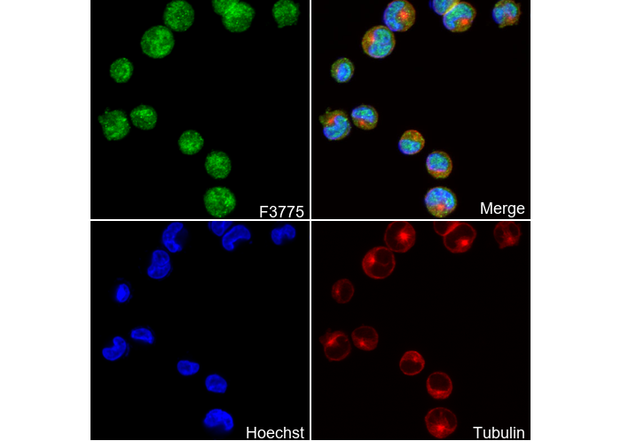 • Immunofluorescent analysis of K562 cells using F3775 (green, 1:50), Hoechst (blue) and tubulin (Red).