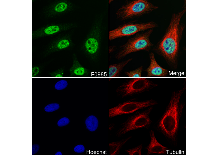• Immunofluorescent analysis of Hela cells using F0985 (green, 1:100), Hoechst (blue) and tubulin (Red).