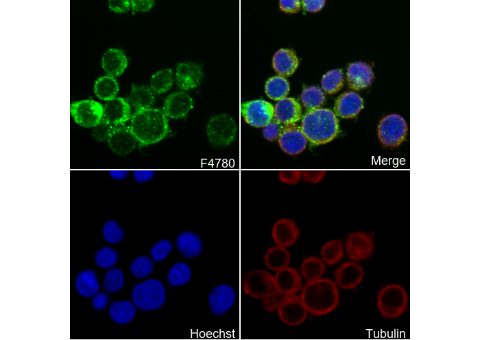 • Immunofluorescent analysis of Jurkat cells using F4780 (green, 1:50), Hoechst (blue) and tubulin (Red).