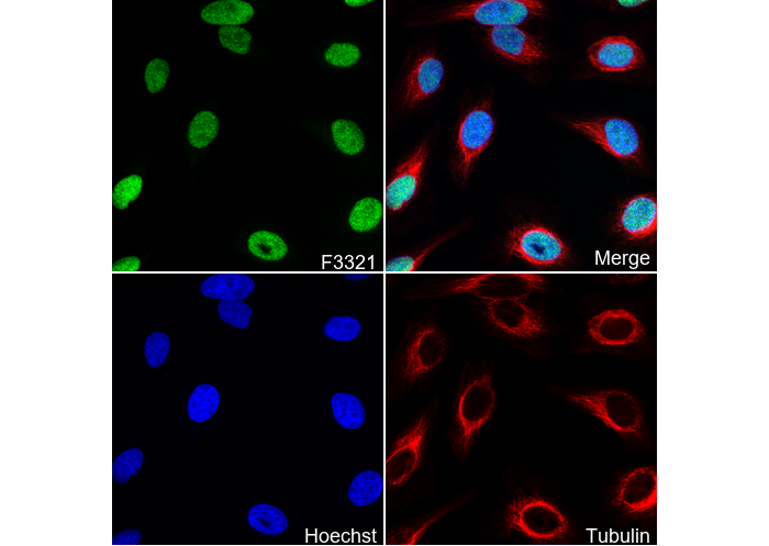 • Immunofluorescent analysis of Hela cells using F3321 (green, 1:50), Hoechst (blue) and tubulin (Red).