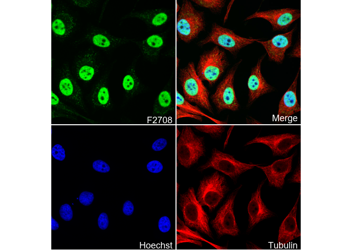 • Immunofluorescent analysis of Hela cells using F2708 (green, 1:200), Hoechst (blue) and tubulin (Red).