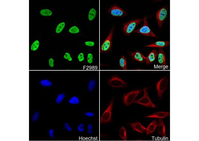 • Immunofluorescent analysis of Hela cells using F2989 (green, 1:50), Hoechst (blue) and tubulin (Red).