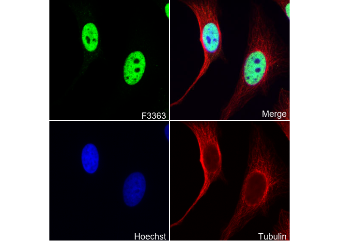 • Immunofluorescent analysis of Hela cells using F3363 (green, 1:250), Hoechst (blue) and tubulin (Red).