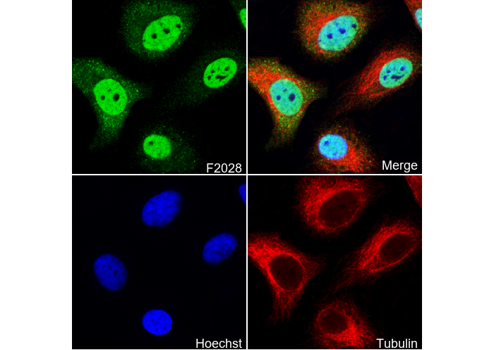 • Immunofluorescent analysis of Hela cells using F2028 (green, 1:2000), Hoechst (blue) and tubulin (Red).
