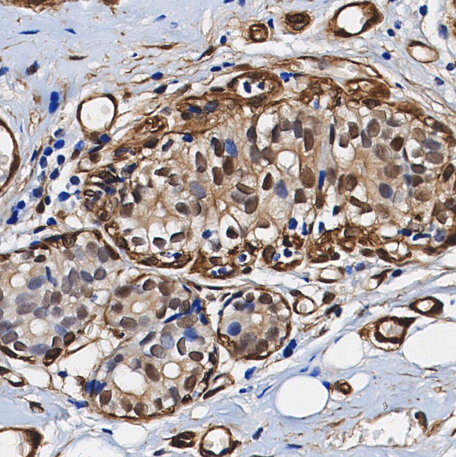 • Immunohistochemical analysis of formalin fixed paraffin embedded human Breast Cancer tissue with F2028 at 1/100 dilution.