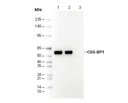 CUG-BP1 Antibody [E13H8] detects endogenous levels of CUG-BP1 proteins.