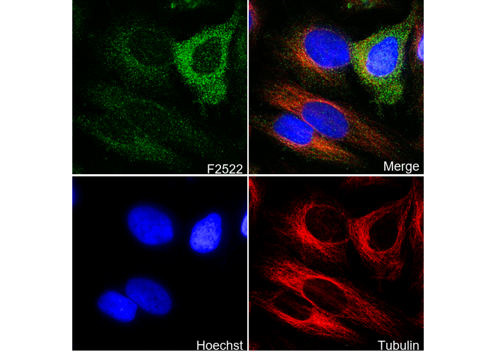 • Immunofluorescent analysis of Hela cells using F2522 (green, 1:100), Hoechst (blue) and tubulin (Red).