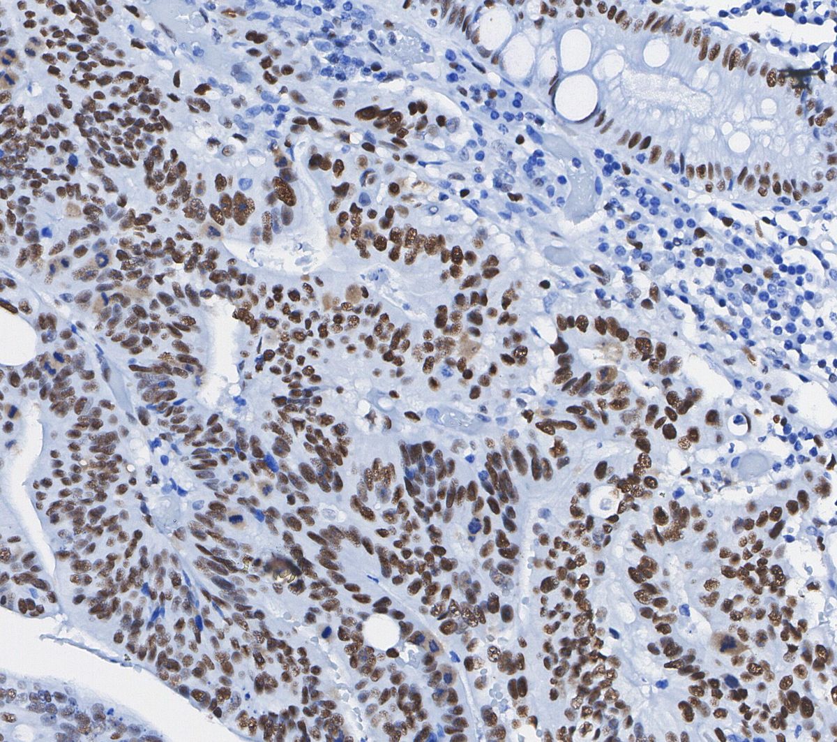 • Immunohistochemical analysis of formalin fixed paraffin embedded human Colorectal cancer tissue with F0095 at 1/500 dilution.