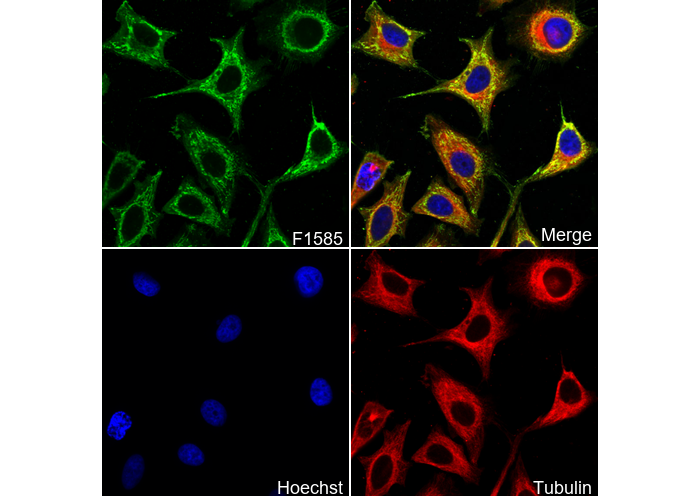 • Immunofluorescent analysis of Hela cells using F1585 (green, 1:200), Hoechst (blue) and tubulin (Red).