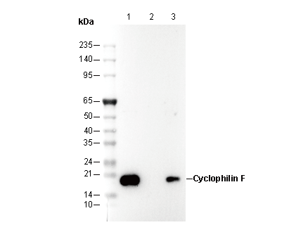 • Lane 1: HEK-293T , Lane 2: HEK-293T (KO Cyclophilin F) , Lane 3: HeLa