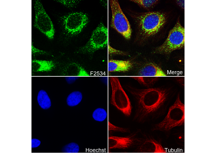 • Immunofluorescent analysis of Hela cells using F2534 (green, 1:100), Hoechst (blue) and tubulin (Red).