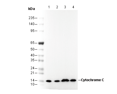 Cytochrome C Antibody [A9D24] recognizes endogenous levels of total Cytochrome C protein.