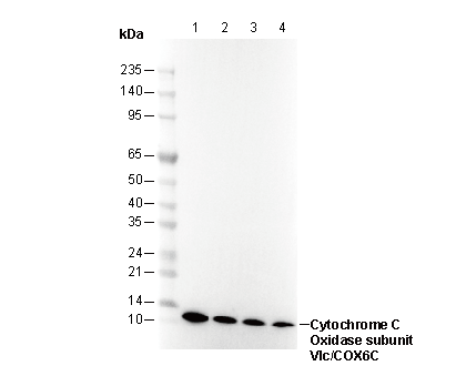 Cytochrome C Oxidase subunit VIc/COX6C Antibody [D5G16] recognizes endogenous levels of total Cytochrome C Oxidase subunit VIc/COX6C protein.
