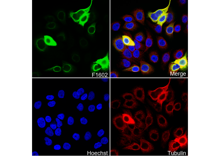 • Immunofluorescent analysis of HACAT cells using F1602 (green, 1:150), Hoechst (blue) and tubulin (Red).