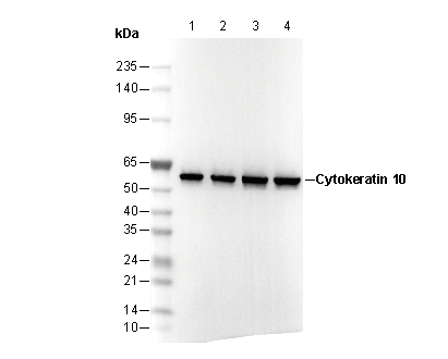 Cytokeratin 10 Antibody [H11C11] detects total endogenous levels of Cytokeratin 10 protein.