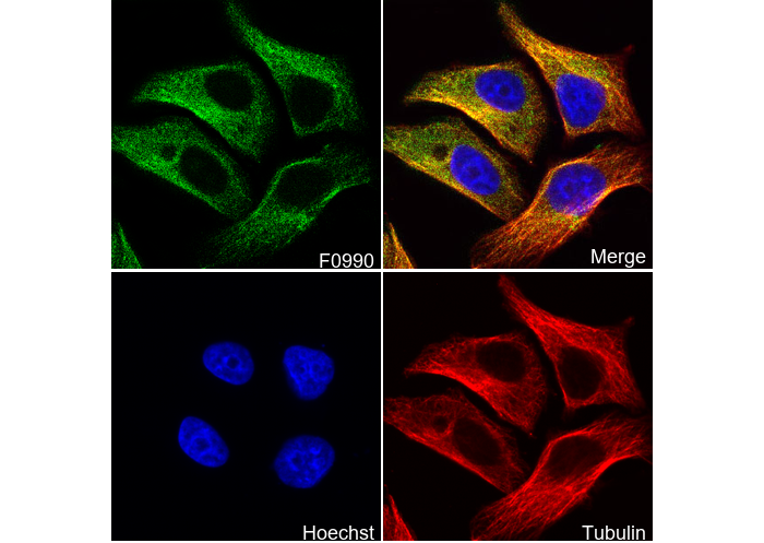 • Immunofluorescent analysis of HepG2 cells using F0990 (green, 1:450), Hoechst (blue) and tubulin (Red).