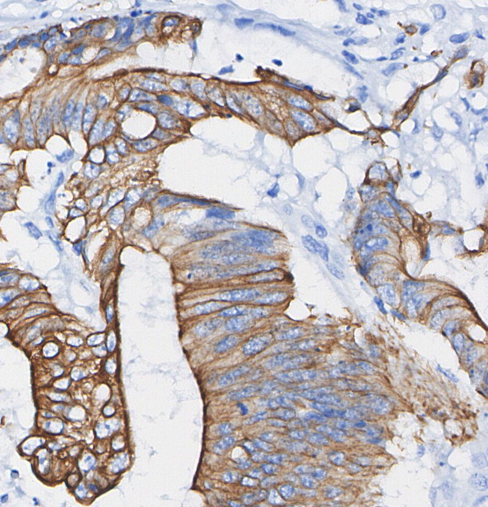 • Immunohistochemical analysis of formalin fixed paraffin embedded human Colorectal cancer tissue with F0990 at 1/100 dilution.