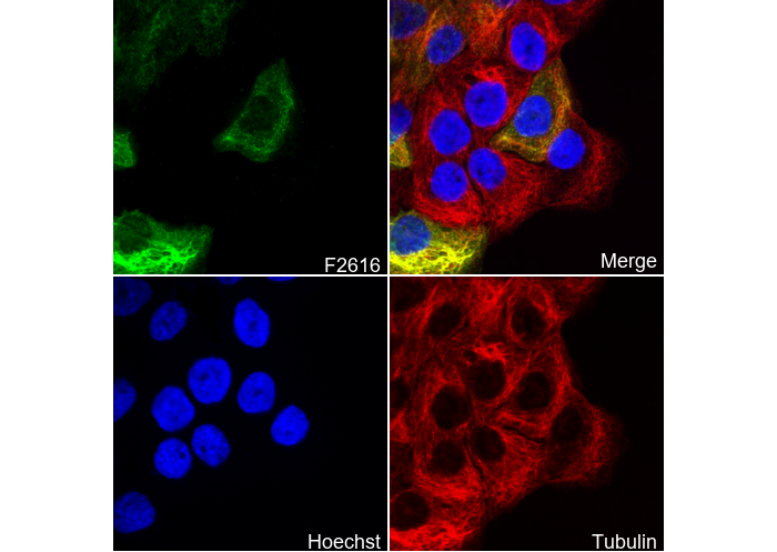 • Immunofluorescent analysis of A431 cells using F2616 (green, 1:50), Hoechst (blue) and tubulin (Red).