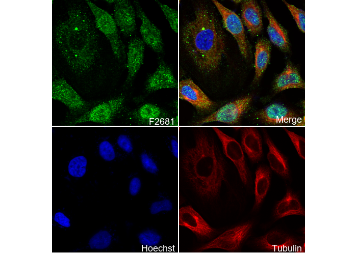 • Immunofluorescent analysis of Hela cells using F2681 (green, 1:250), Hoechst (blue) and tubulin (Red).