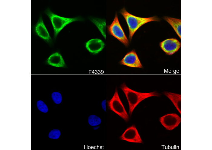 • Immunofluorescent analysis of MCF-7 cells using F4339 (green, 1:200), Hoechst (blue) and tubulin (Red).