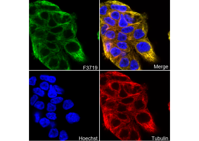 • Immunofluorescent analysis of A431 cells using F3719 (green, 1:1000), Hoechst (blue) and tubulin (Red).