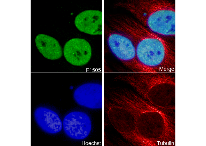 • Immunofluorescent analysis of Hela cells using F1505 (green, 1:400), Hoechst (blue) and tubulin (Red).
