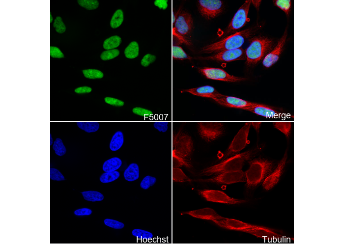 • Immunofluorescent analysis of Hela cells using F5007 (green, 1:100), Hoechst (blue) and tubulin (Red).