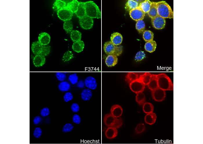 • Immunofluorescent analysis of Neuro-2a cells using F3744 (green, 1:250), Hoechst (blue) and tubulin (Red).