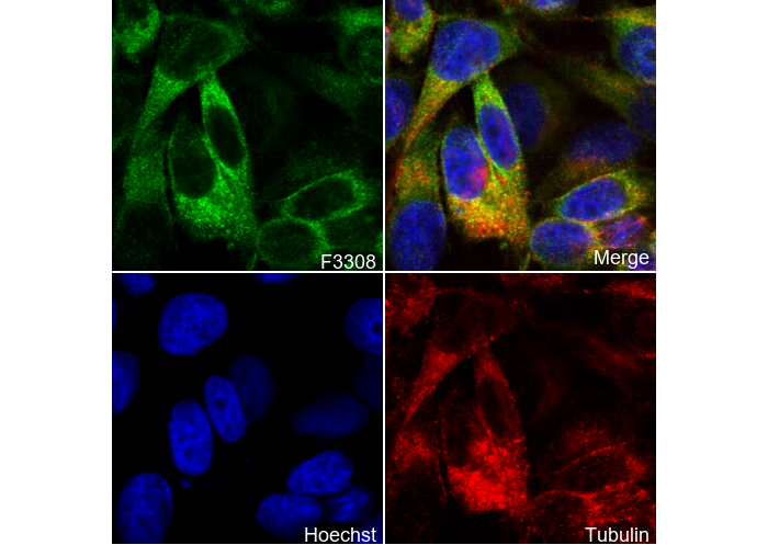 • Immunofluorescent analysis of Hela cells using F3308 (green, 1:50), Hoechst (blue) and tubulin (Red).