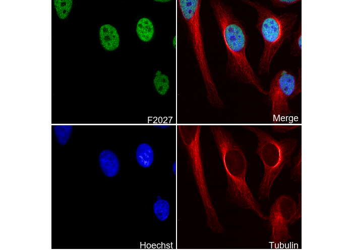 • Immunofluorescent analysis of Hela cells using F2027 (green, 1:1000), Hoechst (blue) and tubulin (Red).