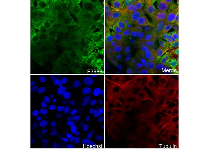 • Immunofluorescent analysis of PC-12 cells using F3986 (green, 1:230), Hoechst (blue) and tubulin (Red).