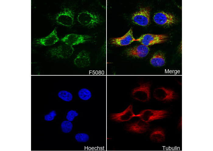 • Immunofluorescent analysis of Hela cells using F5080 (green, 1:50), Hoechst (blue) and tubulin (Red).