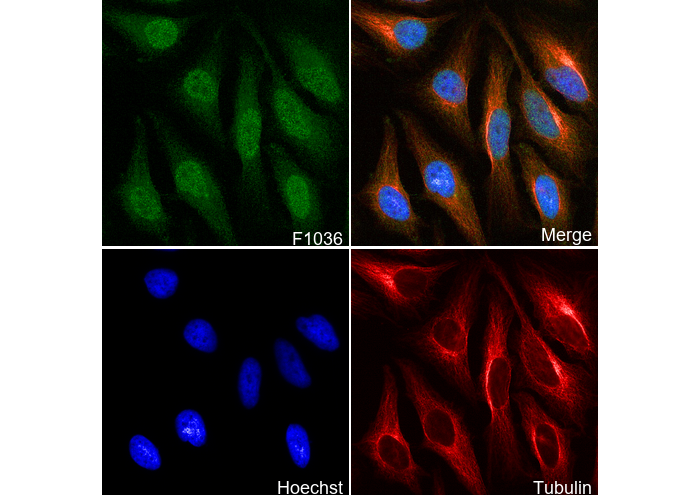 • Immunofluorescent analysis of Hela cells using F1036 (green, 1:1000), Hoechst (blue) and tubulin (Red).