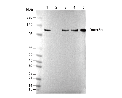 • Lane 1: HeLa, Lane 2: HeLa (koDNMT3A), Lane 3: HEK-293, Lane 4: Mouse brain, Lane 5: Mouse skin