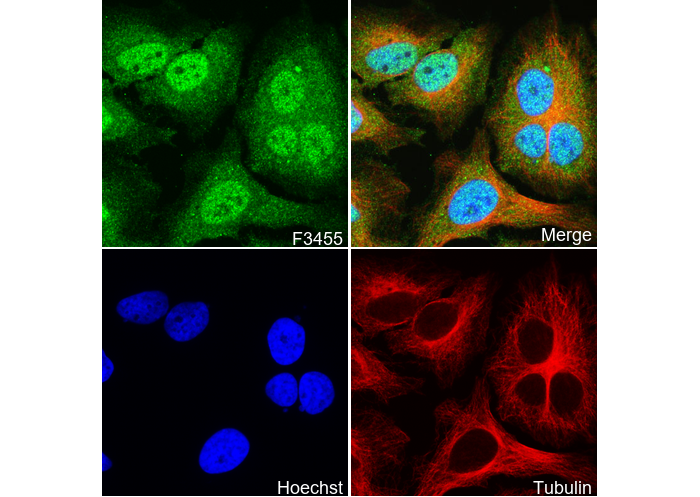 • Immunofluorescent analysis of Hela cells using F3455 (green, 1:100), Hoechst (blue) and tubulin (Red).