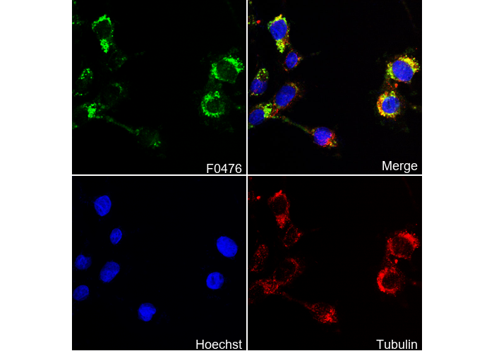• Immunofluorescent analysis of HT1080 cells using F0476 (green, 1:50), Hoechst (blue) and tubulin (Red).