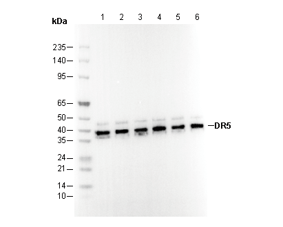DR5 Antibody [M13C19] recognizes endogenous levels of total DR5 protein. This antibody detects both the short and long isoforms of DR5.