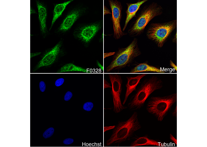 • Immunofluorescent analysis of Hela cells using F0328 (green, 1:50), Hoechst (blue) and tubulin (Red).
