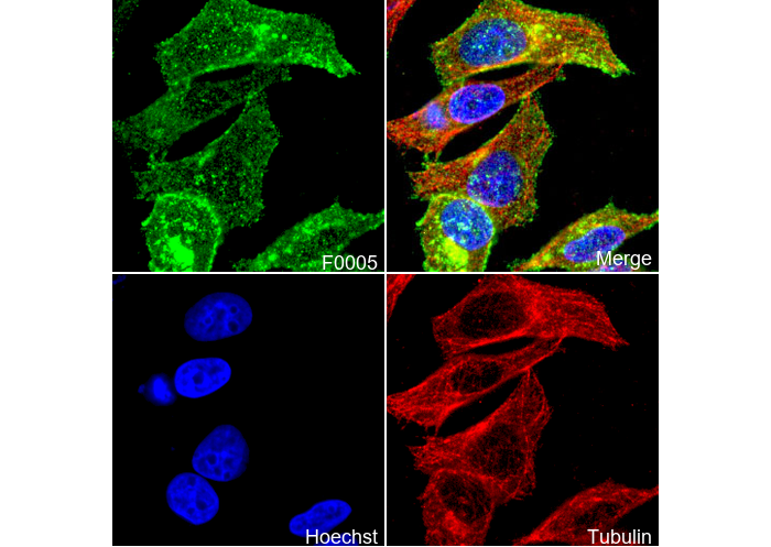 • Immunofluorescent analysis of MCF-7 cells using F0005 (green, 1:1600), Hoechst (blue) and tubulin (Red).