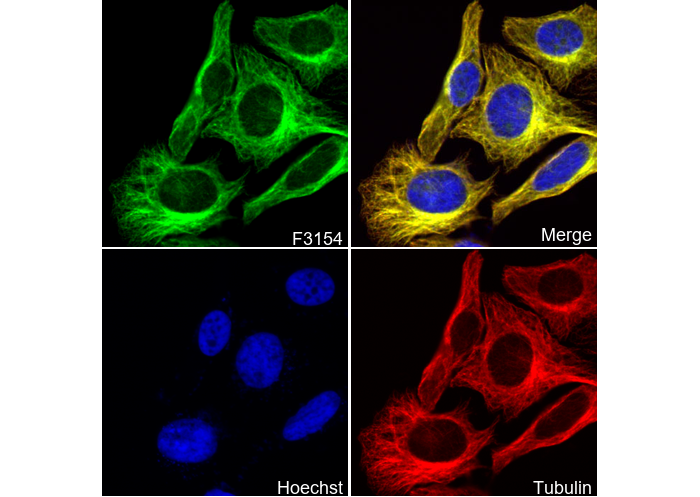 • Immunofluorescent analysis of Hela cells using F3154 (green, 1:250), Hoechst (blue) and tubulin (Red).
