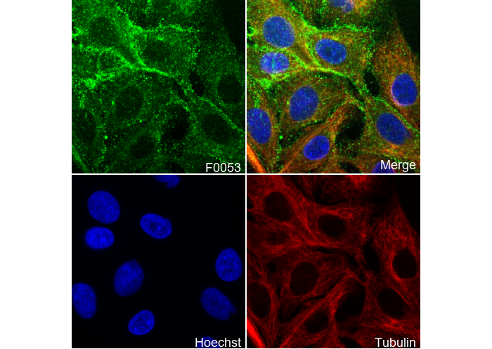 • Immunofluorescent analysis of A549 cells using F0053 (green, 1:50), Hoechst (blue) and tubulin (Red).