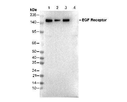 • Lane 1: A431, Lane 2: BxPC3, Lane 3: HeLa, Lane 4: Hela (koEGFR)