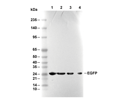 • Lane 1: Recombinant GFP at 1 µg, Lane 2: Recombinant GFP at 0.5 µg, Lane 3: Recombinant GFP at 0.25 µg, Lane 4: Recombinant GFP at 0.125 µg
