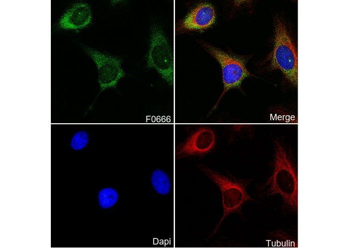 • Immunofluorescent analysis of Hela cells using F0666 (green, 1:200), Hoechst (blue) and tubulin (Red).